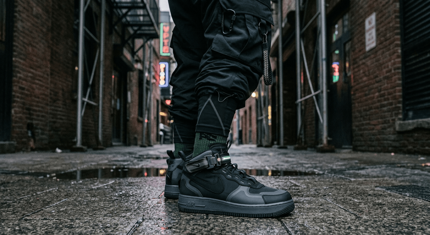 - Анатомия успеха: Ремешок добавляет обуви индустриальный, слегка агрессивный вид. Дизайнеры часто используют Mid-версию для экспериментов с нестандартными материалами — канвасом, рипстопом и светоотражающими элементами.