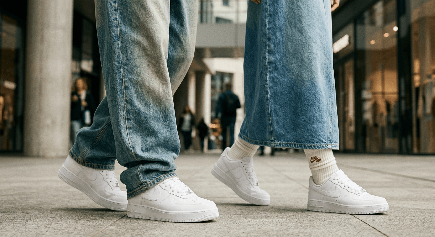 - С чем носить: В эпоху возвращения широких джинсов (baggy jeans), брюк карго и парашютов, массивная подошва низких «форсов» идеально балансирует объемный низ. Девушки все чаще сочетают их с макси-юбками из денима, легкими платьями-комбинациями и высокими белыми носками.